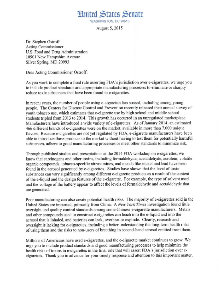 U.S. Senators Tom Udall (D-N.M.), Richard Blumenthal (D-Conn.), Barbara Boxer (D-Calif.), Sherrod Brown (D-Ohio), Dick Durbin (D-Ill.), Amy Klobuchar (D-Minn.), Jack Reed (D-R.I.) and Brian Schatz (D-Hawaii) called for clear product standards and good manufacturing processes to combat the health risks of toxic substances in e-cigarettes as the U.S. Food and Drug Administration finalizes its first regulations of the aerosol-producing products.