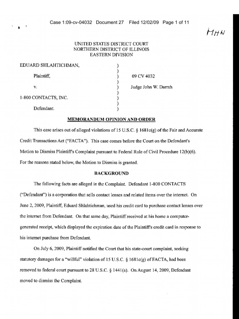 June 2, 2009, Plaintiff, Eduard Shlahtichman, used his credit card to purchase contact lenses over