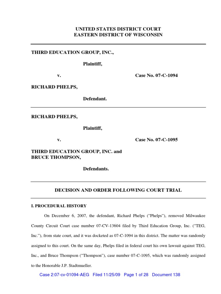 In case number 07-C-1095, regarding Phelps’ complaint against TEG, Inc. and
