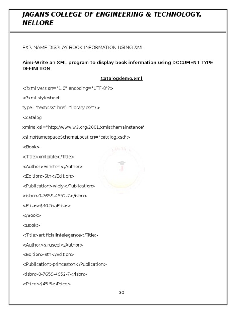 Aim:-Write an XML program to display book information using DOCUMENT TYPE