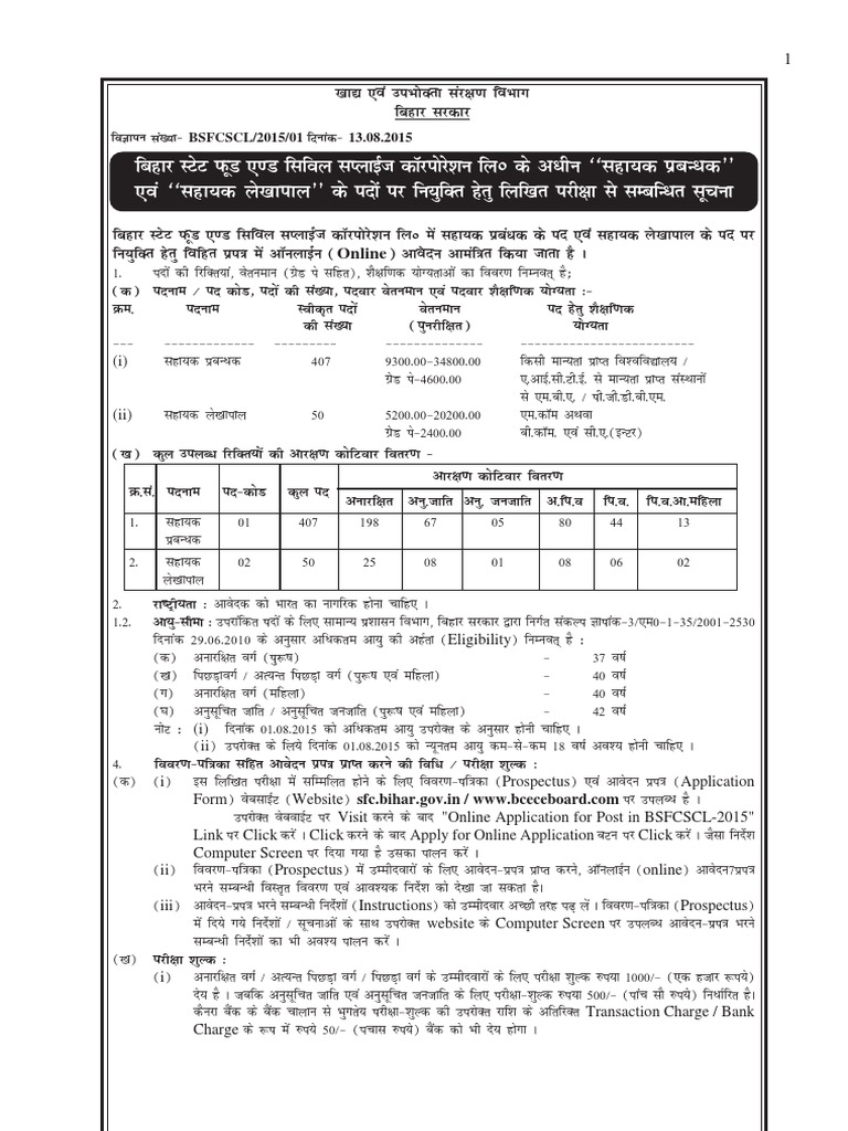 foKkiu la[;k& BSFCSCL/2015/01 fnukad& 13.08.2015
