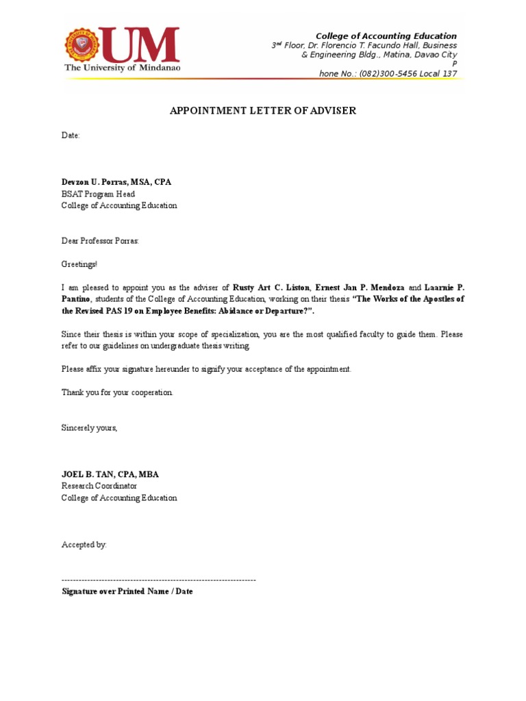I am pleased to appoint you as the adviser of Rusty Art C. Liston, Ernest Jan P. Mendoza and Laarnie P.