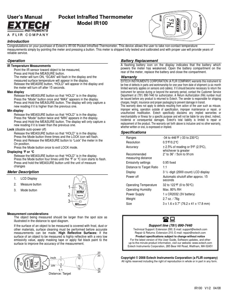 Congratulations on your purchase of Extechs IR100 Pocket InfraRed Thermometer. This device allows the user to take non-contact temperature