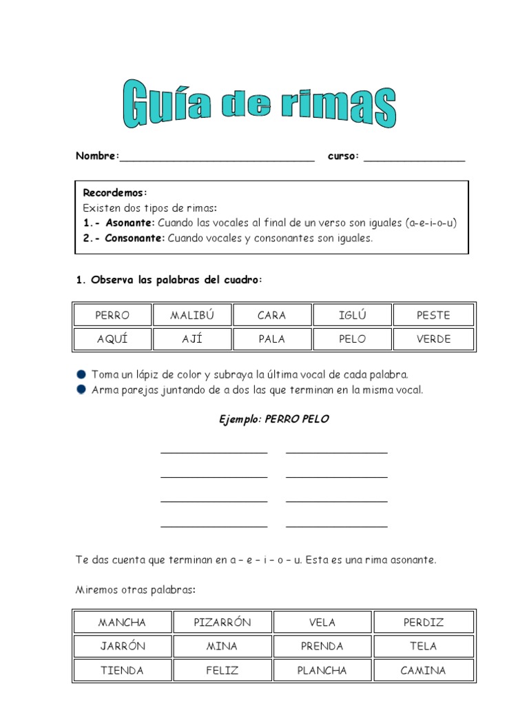 1. Completa en el espacio con palabras que rimen con la palabra inicial.