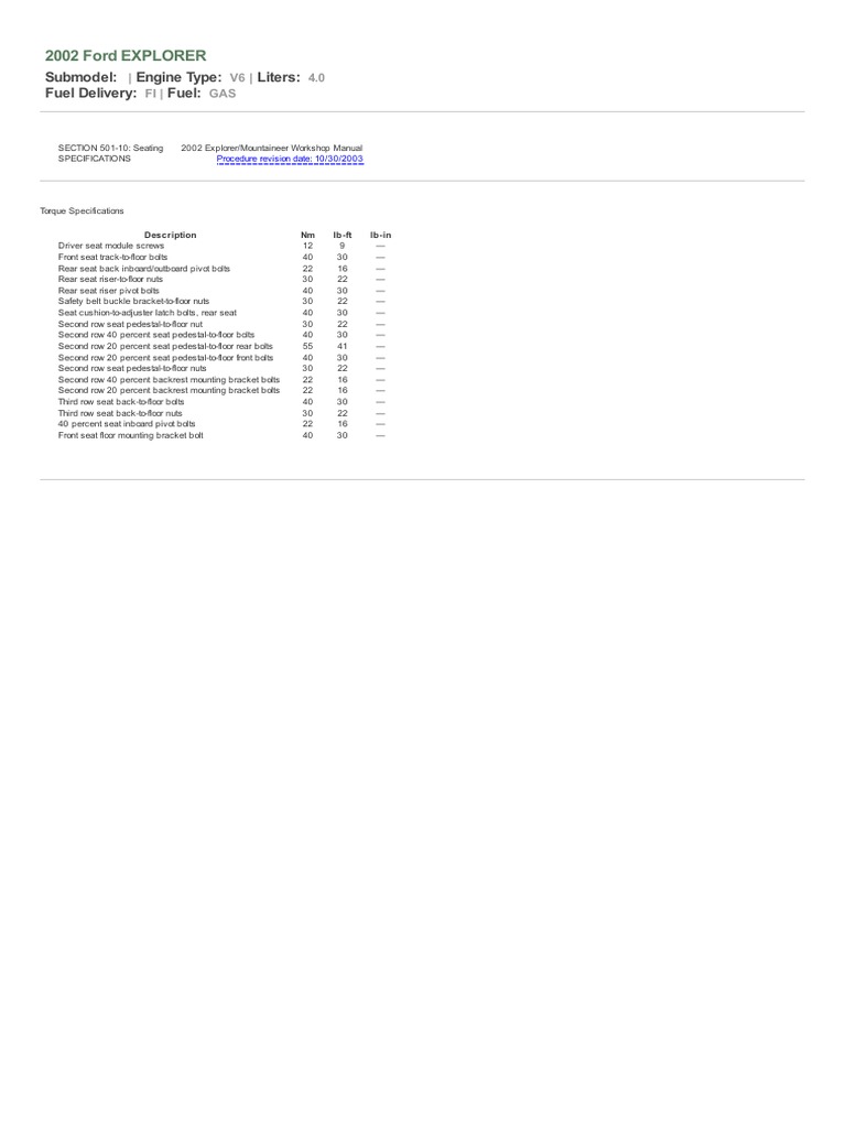 This document provides torque specifications for various seat components on a 2002 Ford Explorer, listing 18 different components and their required torque in Newton meters (Nm) and pound-feet (lb-ft). It includes torque values for components like the driver seat module screws, front seat track bolts, rear seat back pivots, and third row seat back bolts. The document is from the 2002 Explorer/Mountaineer Workshop Manual and provides revision date of the procedure as October 30, 2003.