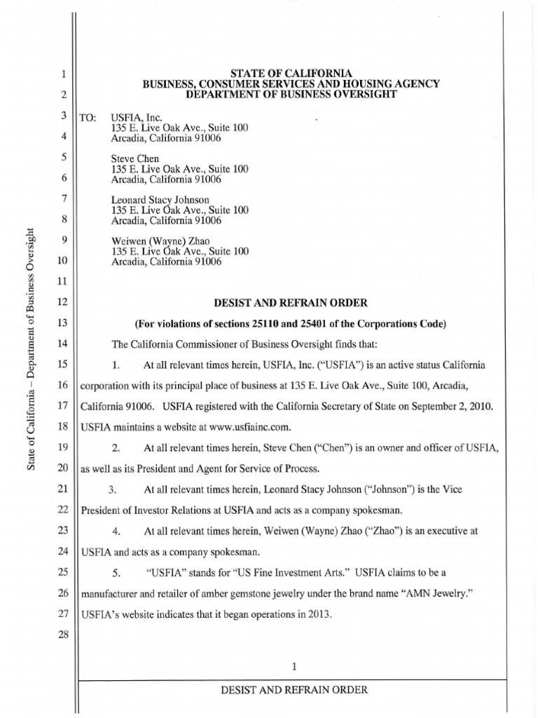 The California Department of Business Oversight filed a desist and refrain order against USFIA and its top three executives on Thursday in an effort to prevent any further securities fraud.