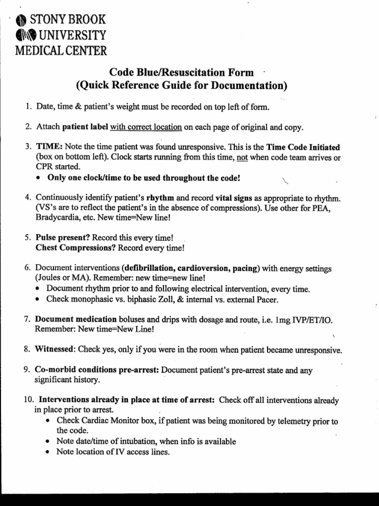 Note location of IV access lines.Code Blue/Resuscitation Form