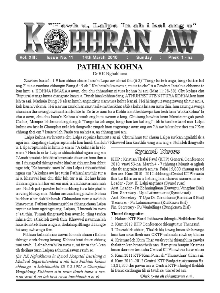 Kohhran Aw : Pathianni chhuak : Dt. 14th March 2010 Phek-2-na