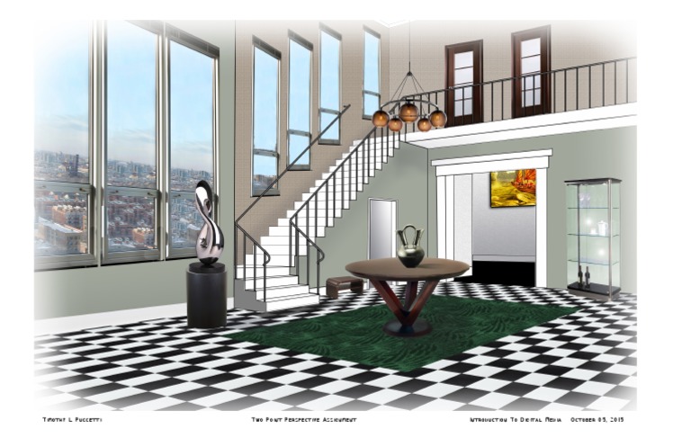 Timothy L Puccetti completed a two point perspective assignment for his Introduction to Digital Media class on October 05, 2015. The assignment required students to render a scene using two point perspective techniques to create an illusion of depth and distance on a flat surface. Puccetti successfully demonstrated his understanding of two point perspective by accurately applying the principles to a digital scene.