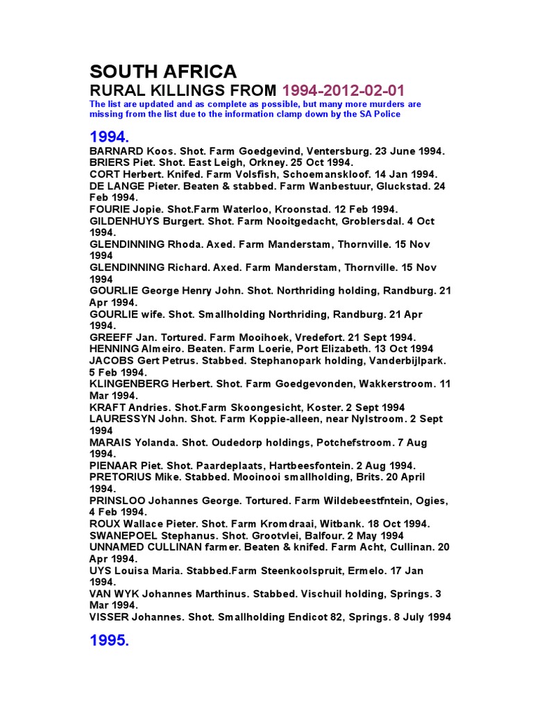 650 PAGE list of names of murdered white people in South Africa