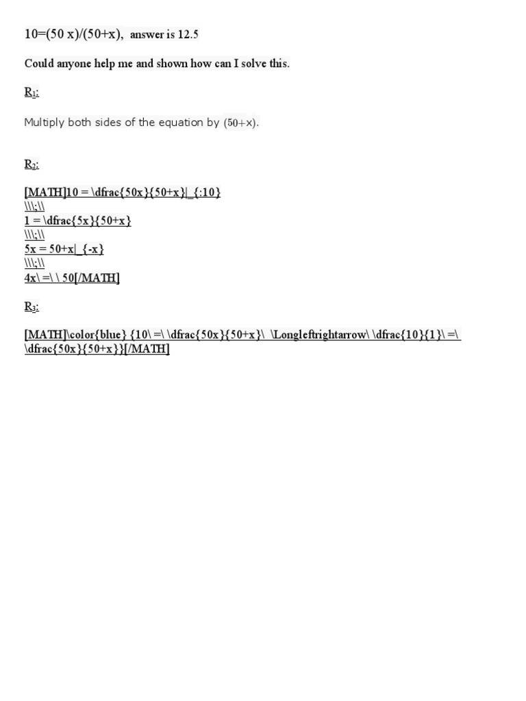 [MATH]\color{blue} {10\ =\ \dfrac{50x}{50+x}\ \Longleftrightarrow\ \dfrac{10}{1}\ =\