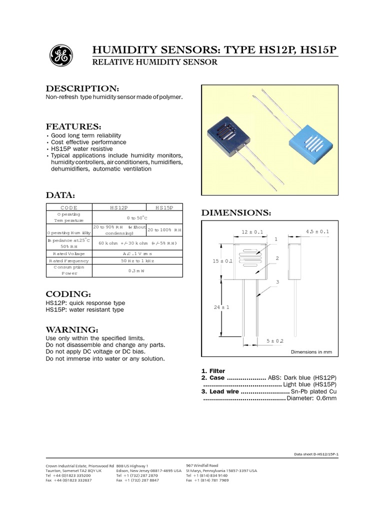 HUMIDITY SENSORS: TYPE HS12P, HS15P