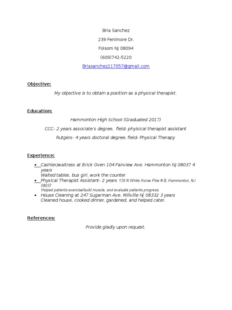 My objective is to obtain a position as a physical therapist.