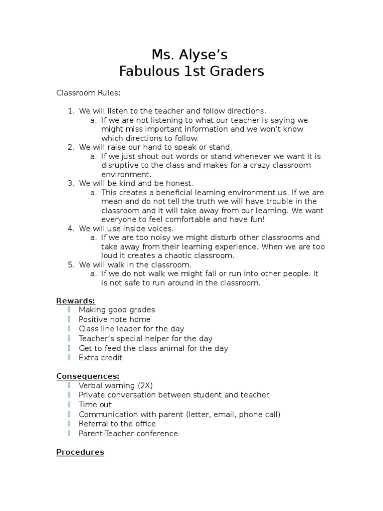 1. We will listen to the teacher and follow directions.
