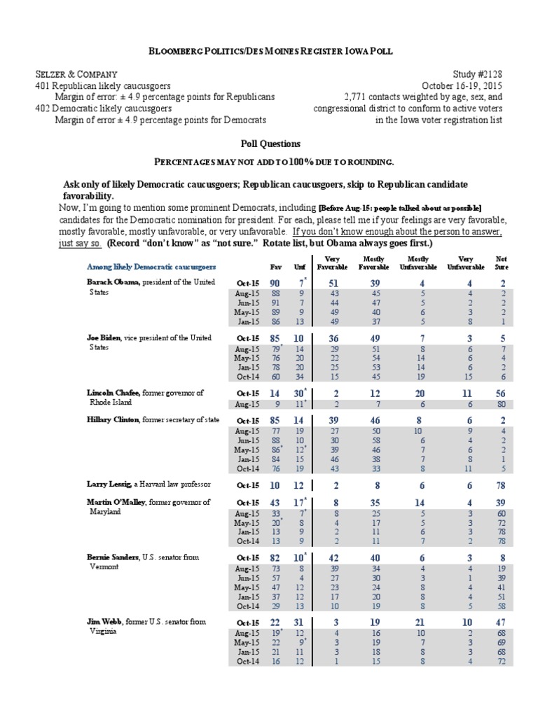 Study #2128 401 Republican likely caucusgoers October 16-19, 2015 Margin of error: ± 4.9 percentage points for Republicans 2,771 contacts weighted by age, sex, and 402 Democratic likely caucusgoers congressional district to conform to active voters Margin of error ± 4.9 percentage points for Democrats in the Iowa voter registration list