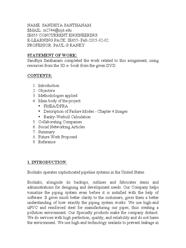 aspects as per the requirement. I learnt a lot about FMEA/DFRA and RankyWeibull Calculator. This assignment was definitely a challenge.