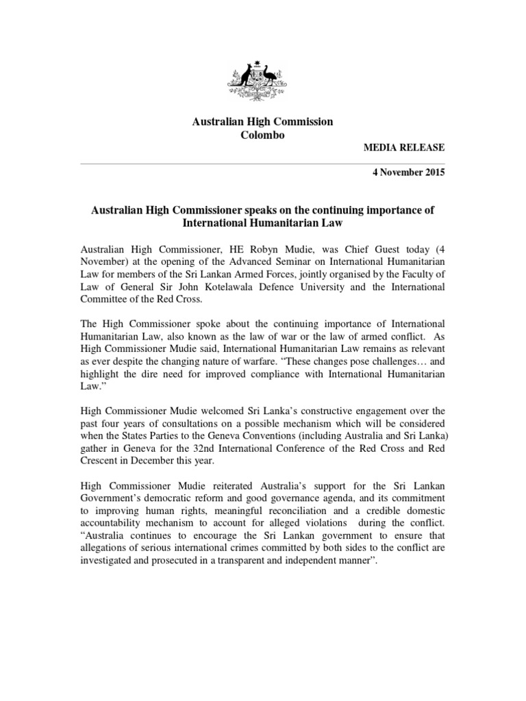 International Humanitarian Law Australian High Commissioner, HE Robyn Mudie, was Chief Guest today (4 November) at the opening of the Advanced Seminar on International Humanitarian Law for members of the Sri Lankan Armed Forces, jointly organised by the Faculty of Law of General Sir John Kotelawala Defence University and the International Committee of the Red Cross. The High Commissioner spoke about the continuing importance of International Humanitarian Law, also known as the law of war or the law of armed conflict. As High Commissioner Mudie said, International Humanitarian Law remains as relevant as ever despite the changing nature of warfare. These changes pose challenges and highlight the dire need for improved compliance with International Humanitarian Law. High Commissioner Mudie welcomed Sri Lankas constructive engagement over the past four years of consultations on a possible mechanism which will be considered when the States Parties to the Geneva Conventions (including Australia and Sri Lanka) gather in Geneva for the 32nd International Conference of the Red Cross and Red Crescent in December this year. High Commissioner Mudie reiterated Australias support for the Sri Lankan Governments democratic reform and good governance agenda, and its commitment to improving human rights, meaningful reconciliation and a credible domestic accountability mechanism to account for alleged violations during the conflict. Australia continues to encourage the Sri Lankan government to ensure that allegations of serious international crimes committed by both sides to the conflict are investigated and prosecuted in a transparent and independent manner.