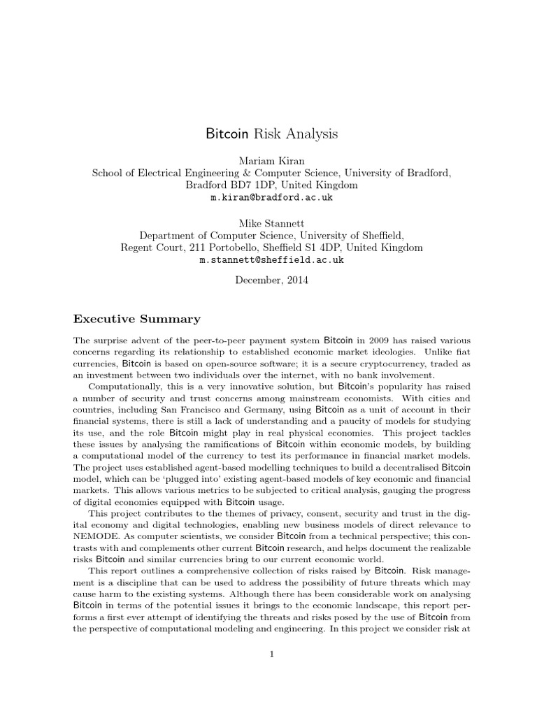 Bitcoin in terms of the potential issues it brings to the economic landscape, this report performs a first ever attempt of identifying the threats and risks posed by the use of Bitcoin from