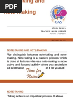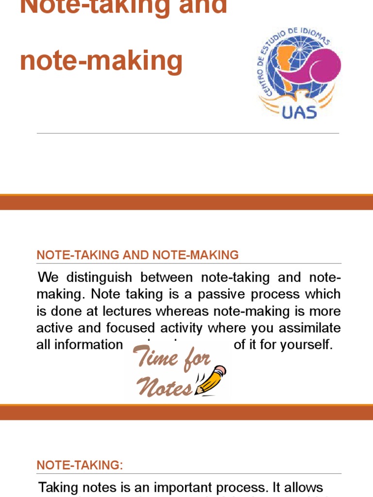 We distinguish between note-taking and notemaking. Note taking is a passive process which