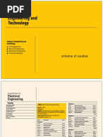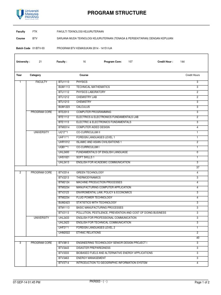 This document outlines the program structure for a Bachelor of Technology in Engineering Technology (Energy and Environment) degree. The program is divided into 4 years and includes courses in the areas of physics, chemistry, mathematics, programming, manufacturing processes, thermodynamics, environmental law and policy, and energy management. In total, students must complete 144 credit hours, including 107 hours of program core courses and 37 hours of university core courses. In the fourth year, students complete a senior design project, industrial training, and elective courses in areas like solar energy systems and geographic information systems.