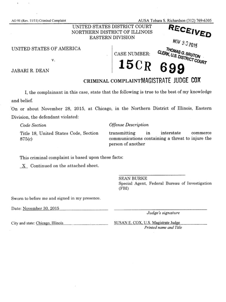 Jabari Dean Criminal Complaint