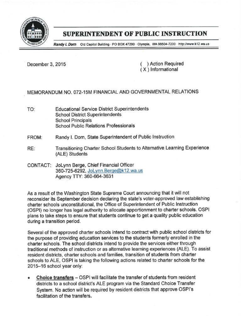 Office of Superintendent of Public Instruction for WA State memo to school districts about placements for charter school students after WA Supreme Court struck down the charter school law in September 2015.