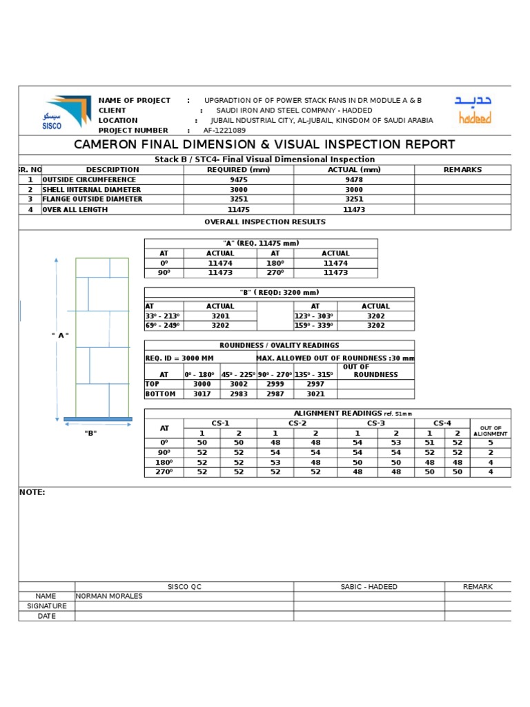 CAMERON FINAL DIMENSION & VISUAL INSPECTION REPORT