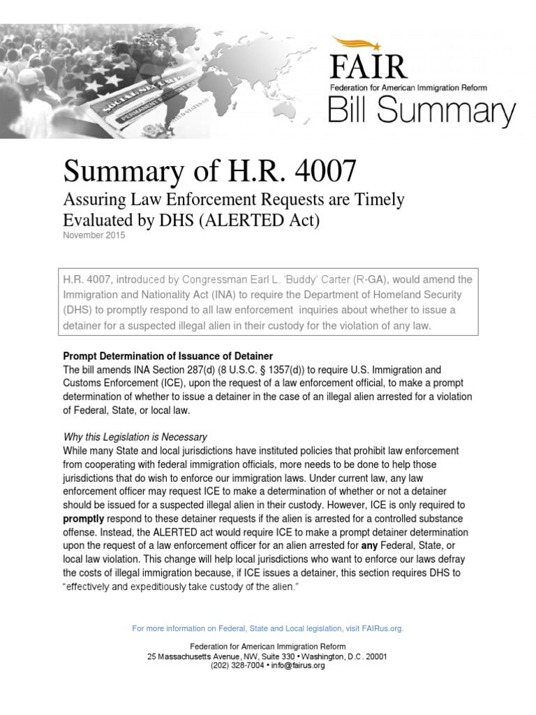 H.R. 4007, introduced by Congressman Earl L. ‘Buddy’ Carter (R-GA), would amend the Immigration and Nationality Act (INA) to require the Department of Homeland Security (DHS) to promptly respond to all law enforcement inquiries about whether to issue a detainer for a suspected illegal alien in their custody for the violation of any law.