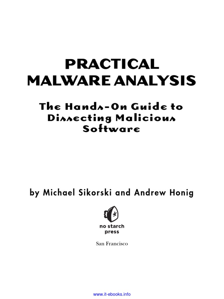 This document appears to be about analyzing malicious software, or malware. It is titled "Practical Malware Analysis" and is authored by Michael Sikorski and Andrew Honig. The document provides hands-on guidance for dissecting and understanding how malicious software works.