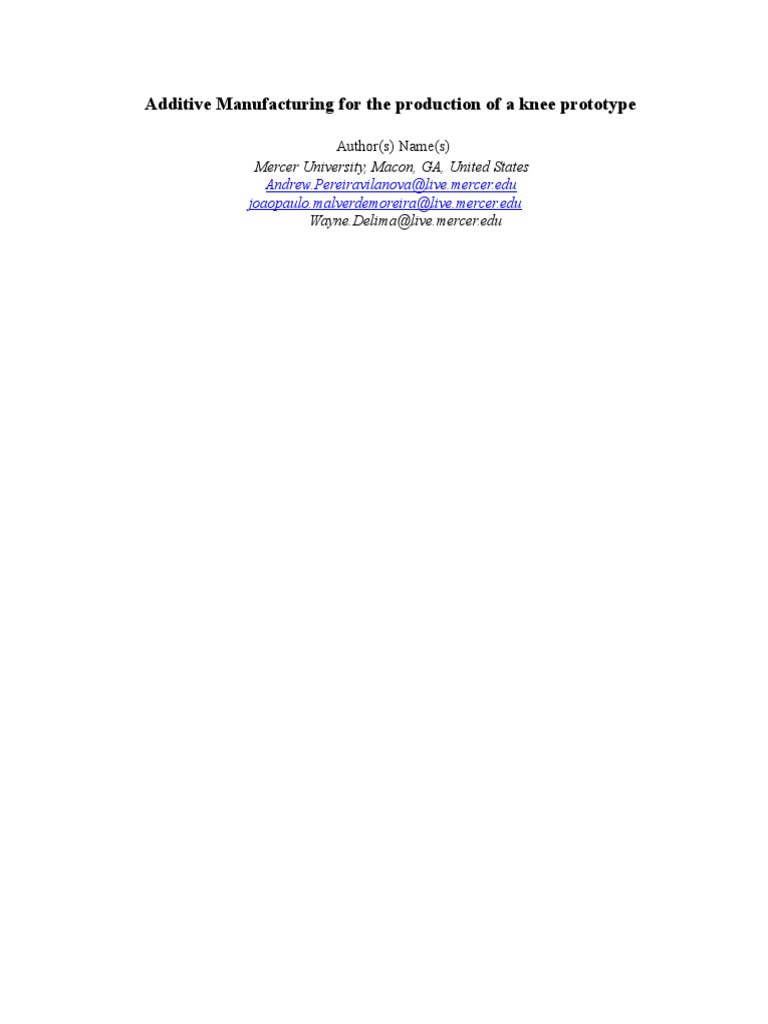 Additive manufacturing was used to produce a knee prototype. The authors, students at Mercer University, created a knee prototype using 3D printing to demonstrate its capabilities for medical applications. Their goal was to explore how additive manufacturing could be applied to produce customized medical devices and implants.
