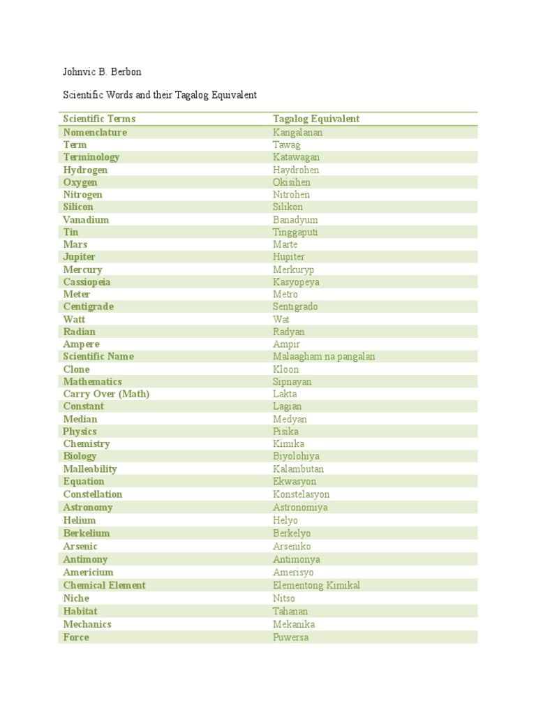 Scientific Words and their Tagalog Equivalent