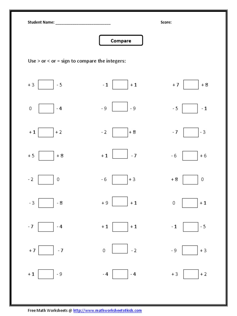 The document contains a student worksheet that asks the student to compare integers using >, <, or = signs. It lists 30 integers for the student to compare. The answers section shows the correct comparisons for each integer pairing.