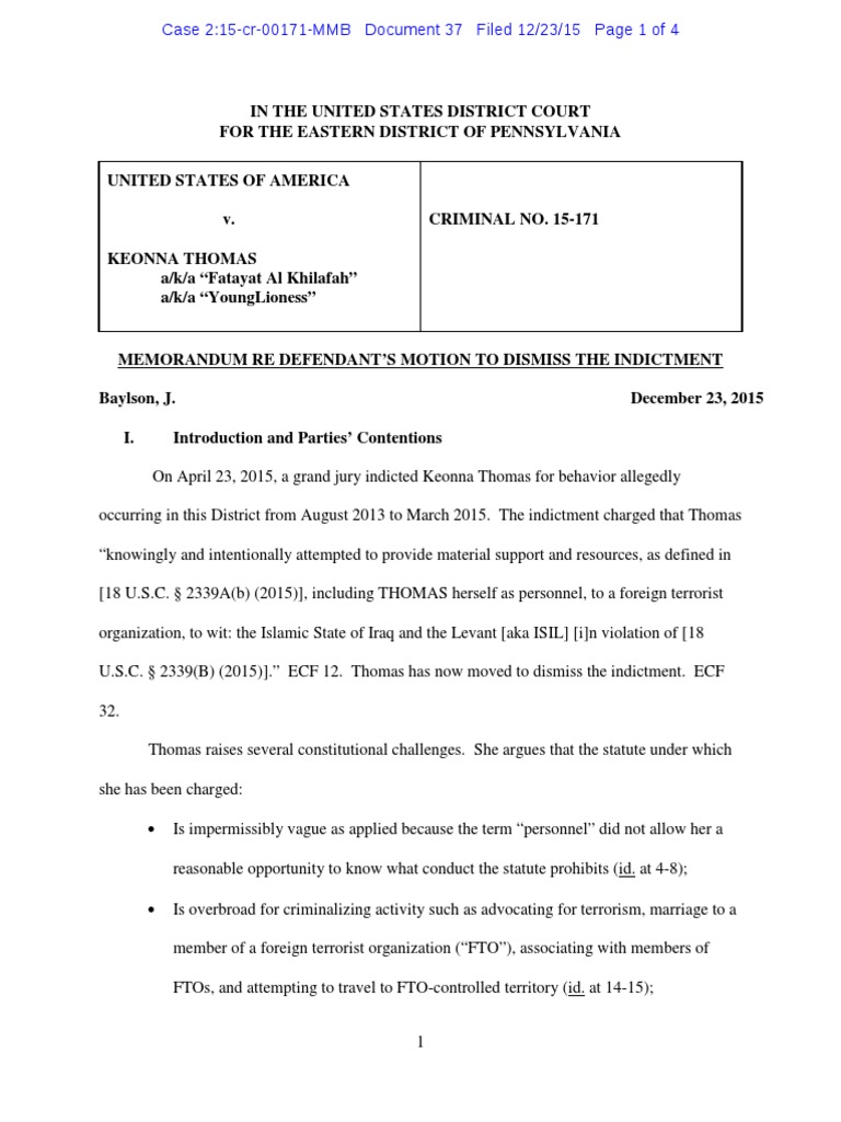 U.S.C. 2339(B) (2015)]. ECF 12. Thomas has now moved to dismiss the indictment. ECF