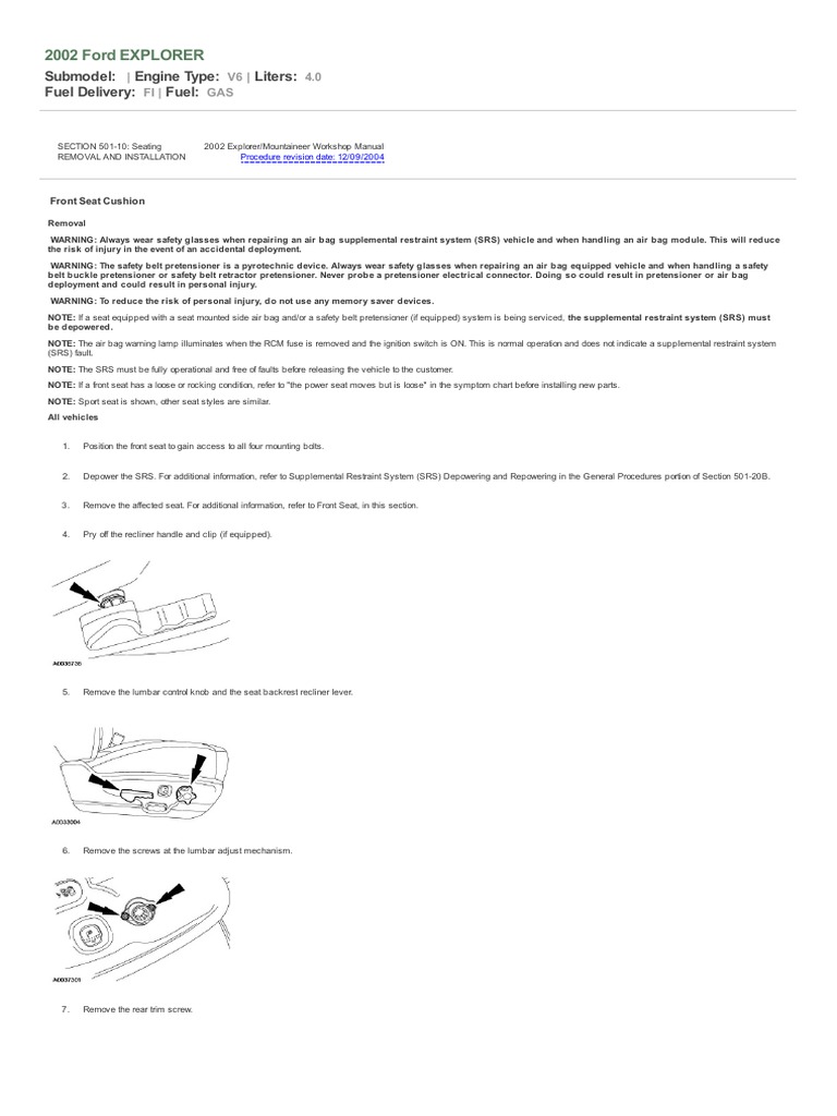 This document provides instructions for removing and installing the front seat cushion of a 2002 Ford Explorer. It warns of safety precautions when working on airbag and seatbelt pretensioner systems. The removal process involves depowering safety systems, removing trim pieces, disconnecting electrical connectors and releasing mounting clips. Installation is the reverse of removal and includes reconnecting safety systems. The document provides notes on vehicle variations and cautions for proper installation.
