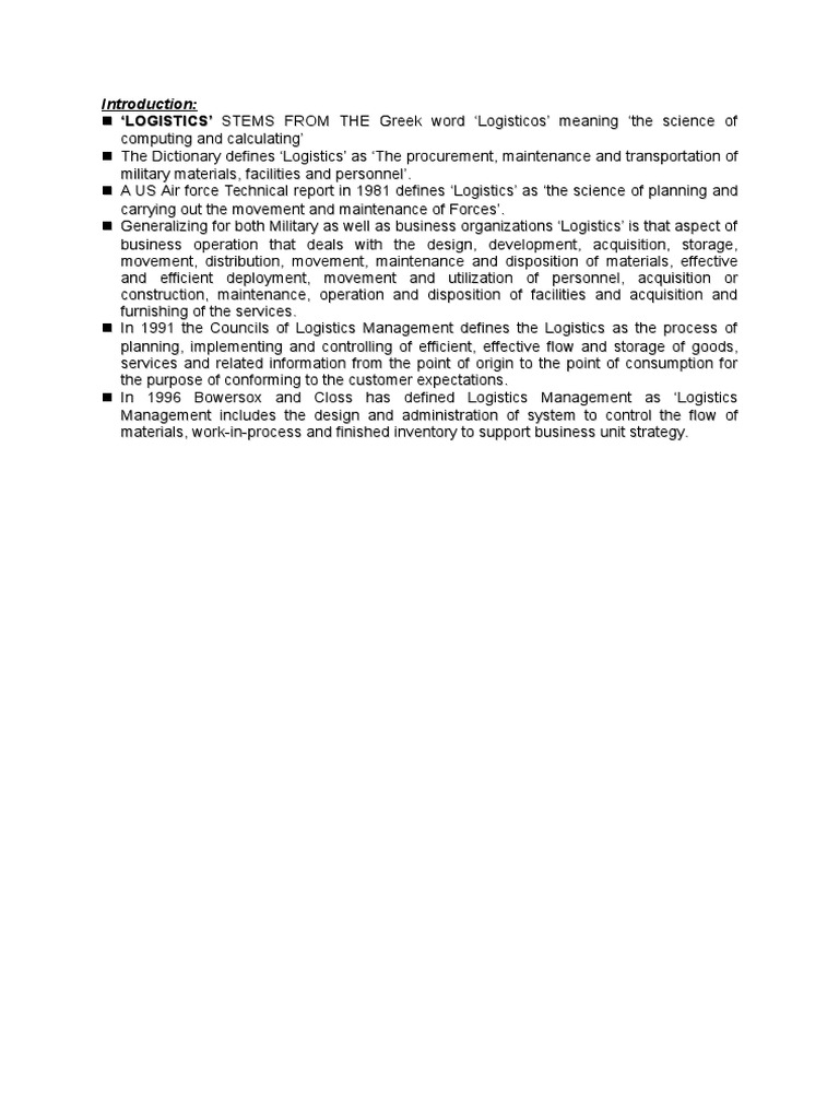 LOGISTICS STEMS FROM THE Greek word Logisticos meaning the science of