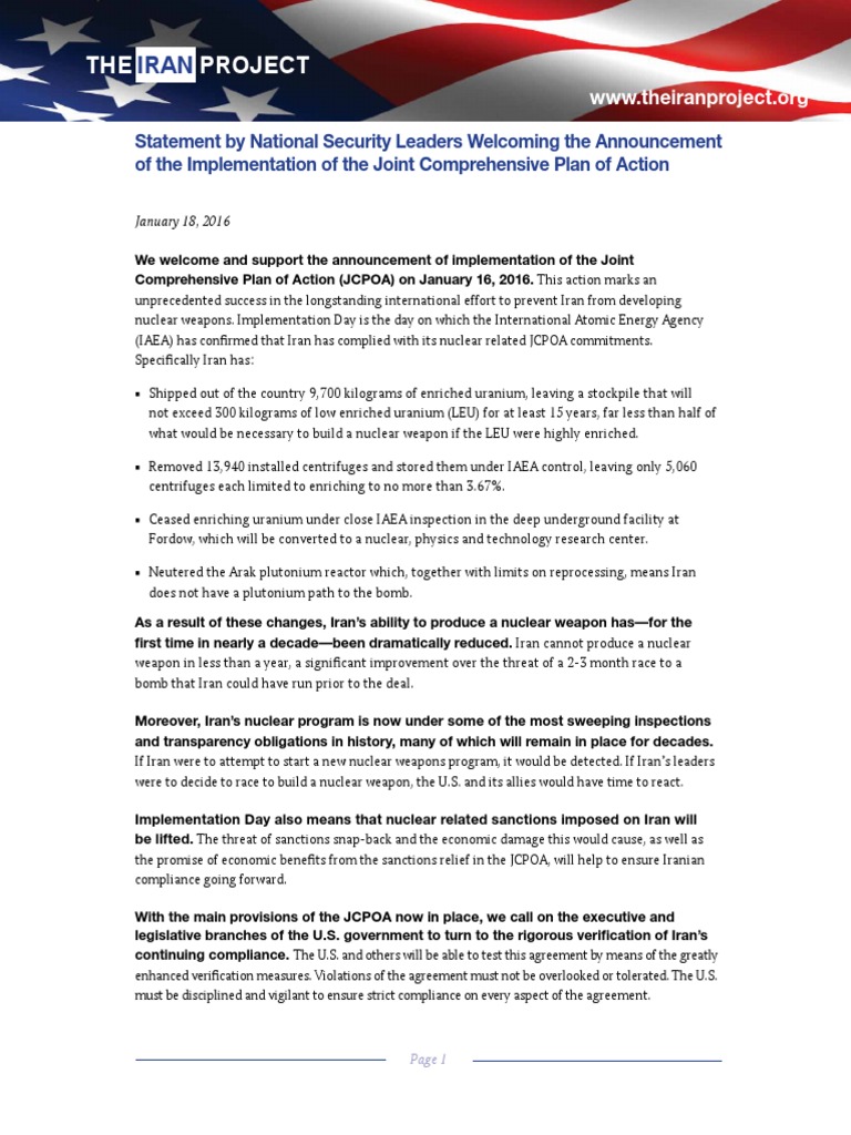 53 national security leaders issued a statement welcoming the implementation of the Iran nuclear agreement and calling on U.S. policymakers to turn to the rigorous verification of Iran’s con…