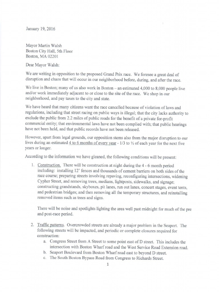 Dear Mayor Walsh: We are writing in opposition to the proposed Grand Prix race. We foresee a great deal of disruption and chaos that will occur in our neighborhood before, during, and after the race. We live in Boston; many of us also work in Boston – an estimated 4,000 to 8,000 people live and/or work immediately adjacent to or close to the site of the race. We shop in our neighborhood, and pay taxes to the city and state. We have heard that many citizens want the race cancelled because of violation of laws and regulations, including that street racing on public ways is illegal; that the city lacks authority to exclude the public from 2.2 miles of public roads for the benefit of a private for-profit commercial entity; that environmental laws have not been complied with; that public hearings have not been held, and that public records have not been released. However, apart from legal grounds, our opposition stems also from the major disruption to our lives during an estimated 4 to 6 months of every year - 1/3 to ½ of each year for the next five years or longer.