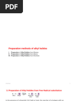 Alkyl halides contain a carbon-halogen (C-X) bond where X is a halogen such as bromine or chlorine. The infrared spectroscopy spectrum of alkyl halides shows absorption bands in three regions: C-H wag of -CH2X from 1300-1150 cm-1, general C-X stretches from 850-515 cm-1, and specific C-Cl stretches from 850-550 cm-1 or C-Br stretches from 690-515 cm-1. The spectra can be complicated by other absorptions from 1250-770 cm-1, especially in smaller alkyl halides.