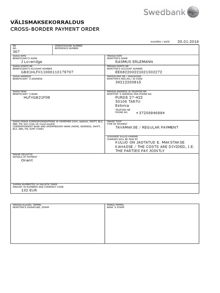 SAAJA PANGA KORRESPONDENTPANK JA VAHEPANK (nimi, aadress, SWIFT, BLZ,