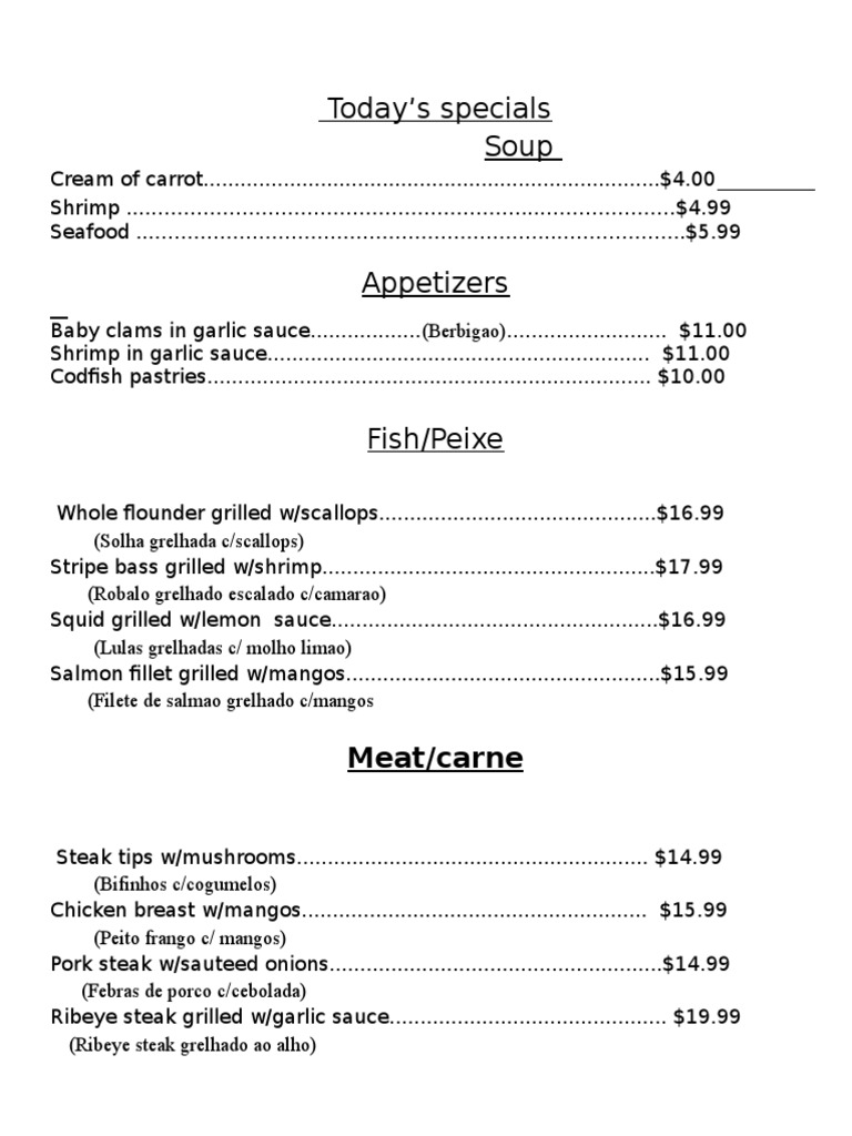 Baby clams in garlic sauce..................(Berbigao).......................... $11.00
