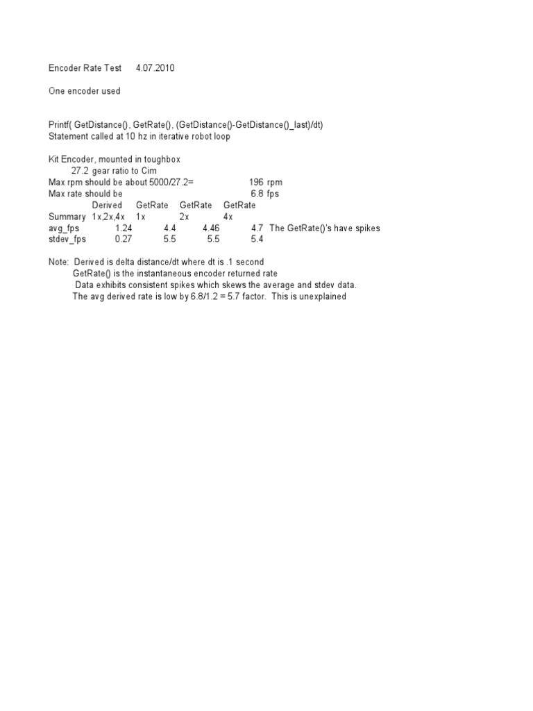 Encoder Rate Test 4.07.2010One encoder usedPrintf( GetDistance(), GetRate(), (GetDistance()-GetDistance()_last)/dt)Statement called at 10 hz in iterative robot loopKit Encoder, mounted in toughbox27.2gear ratio to CimMax rpm should be about 5000/27.2= 196rpmMax rate should be 6.8fpsDerived GetRate GetRate GetRateSummary 1x,2x,4x 1x 2x 4xavg_fps 1.24 4.4 4.46 4.7 The GetRate()'s have spikesstdev_fps 0.27 5.5 5.5 5.4Note: Derived is delta distance/dt where dt is .1 secondGetRate() is the instantaneous encoder returned rateData exhibits consistent spikes which skews the average and stdev data.The avg derived rate is low by 6.8/1.2 = 5.7 factor. This is unexplained