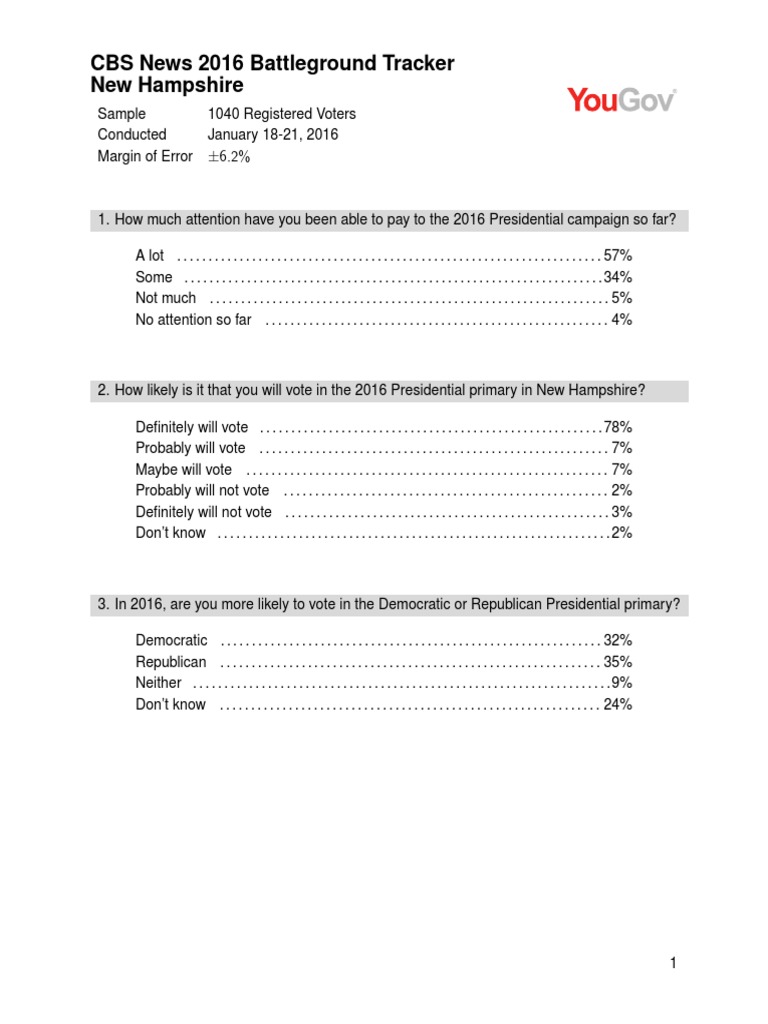 1. How much attention have you been able to pay to the 2016 Presidential campaign so far?A lot ....................................................................57%Some ...................................................................34%Not much ................................................................ 5%No attention so far ....................................................... 4%2. How likely is it that you will vote in the 2016 Presidential primary in New Hampshire?Definitely will vote .......................................................78%Probably will vote ........................................................ 7%Maybe will vote .......................................................... 7%Probably will not vote .................................................... 2%Definitely will not vote ....................................................3%Don’t know ...............................................................2%3. In 2016, are you more likely to vote in the Democratic or Republican Presidential primary?Democratic .............................................................32%Republican ............................................................. 35%Neither ...................................................................9%Don’t know ............................................................. 24%1