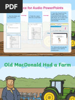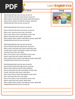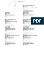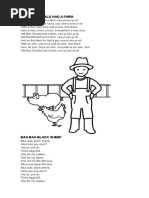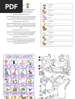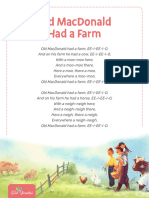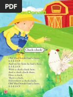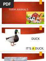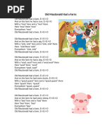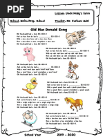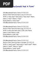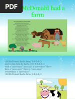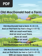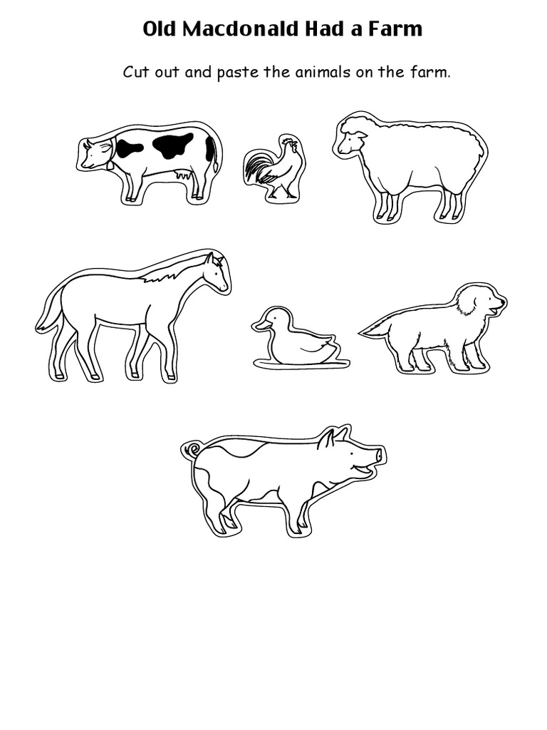 Old Macdonald had a farm with several animals that made characteristic noises. The animals on the farm included cows that mooed, pigs that oinked, horses that neighed, dogs that woofed, ducks that quacked, sheep that baaed, and roosters that cock-a-doodle-dooed. Children were instructed to cut out and paste pictures of the different animals.