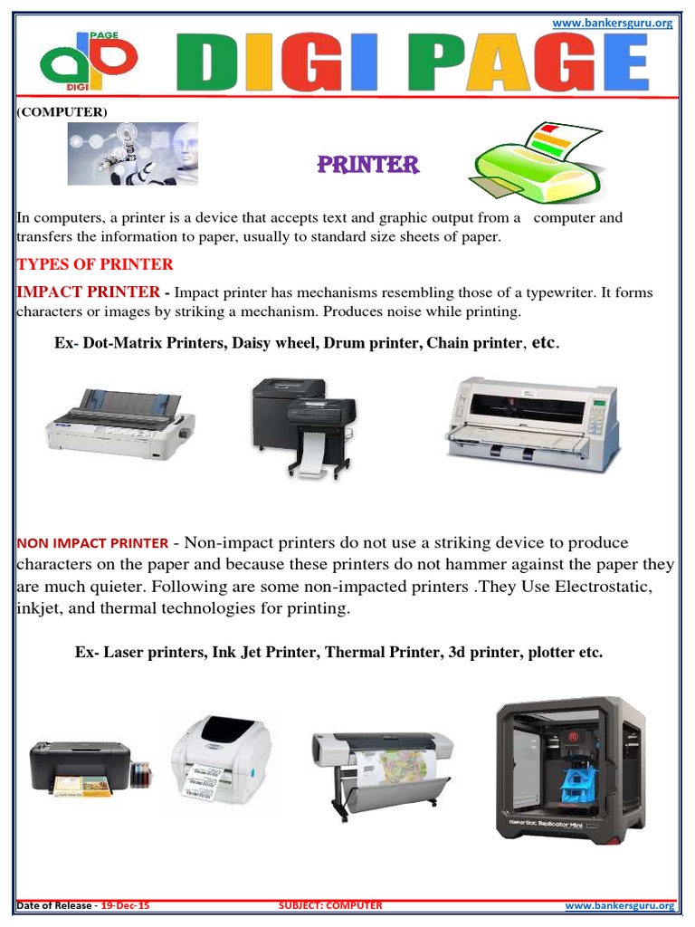 Ex- Dot-Matrix Printers, Daisy wheel, Drum printer, Chain printer, etc.