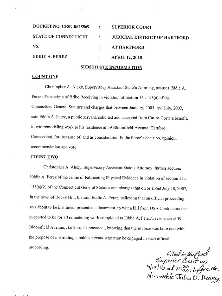 DOCKET NO. CR09-0628569 SUPERIOR COURT STATE OF CONNECTICUT JUDICIAL DISTRICT OF HARTFORD v. At harford. Prosecutors allege that between January, 2005, and July, 2007, said Eddie A. Perez solicited and accepted from Carlos Costa a benefit, to wit: remodeling work to his residence at 59 Bloomfield avenue, Hartford, Connecticut.