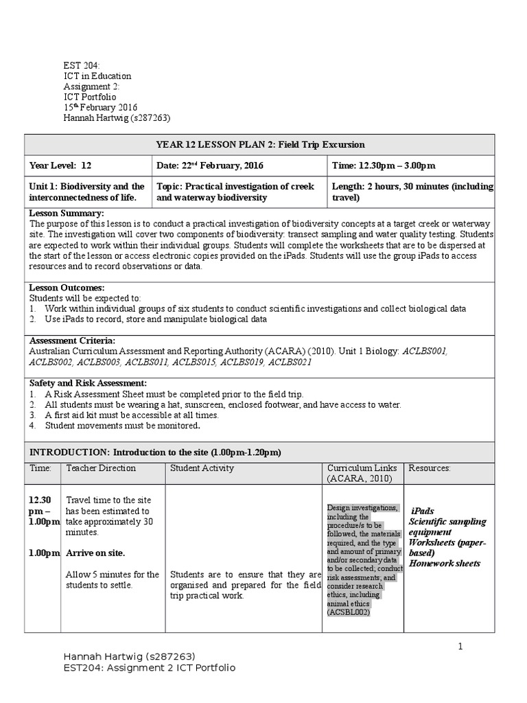YEAR 12 LESSON PLAN 2: Field Trip Excursion