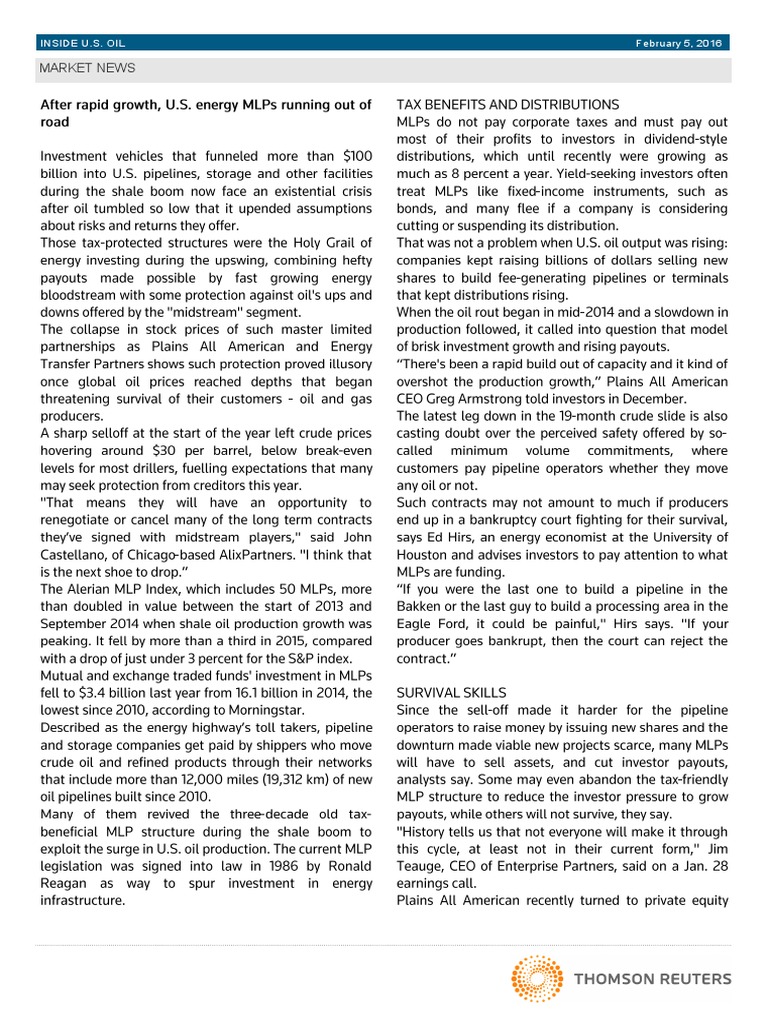 The document discusses the U.S. oil market news for February 5, 2016. It reports that U.S. oil inventories rose more than expected as refinery activity declined, weighing on oil prices. West Texas Intermediate crude fell below $30 per barrel on higher supply and concerns about global demand. The article also notes that gasoline and distillate fuel inventories decreased slightly more than anticipated.