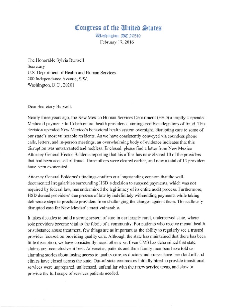 U.S. Sens. Tom Udall and Martin Heinrich, and U.S. Reps. Ben Ray Luján and Michelle Lujan Grisham sent a letter to U.S. Health and Human Services (HHS) Secretary Sylvia Burwell calling for a thorough investigation of the findings in the Attorney General's report on the New Mexico Human Services Department's suspension of Medicaid payments to 15 nonprofit behavioral health providers.
