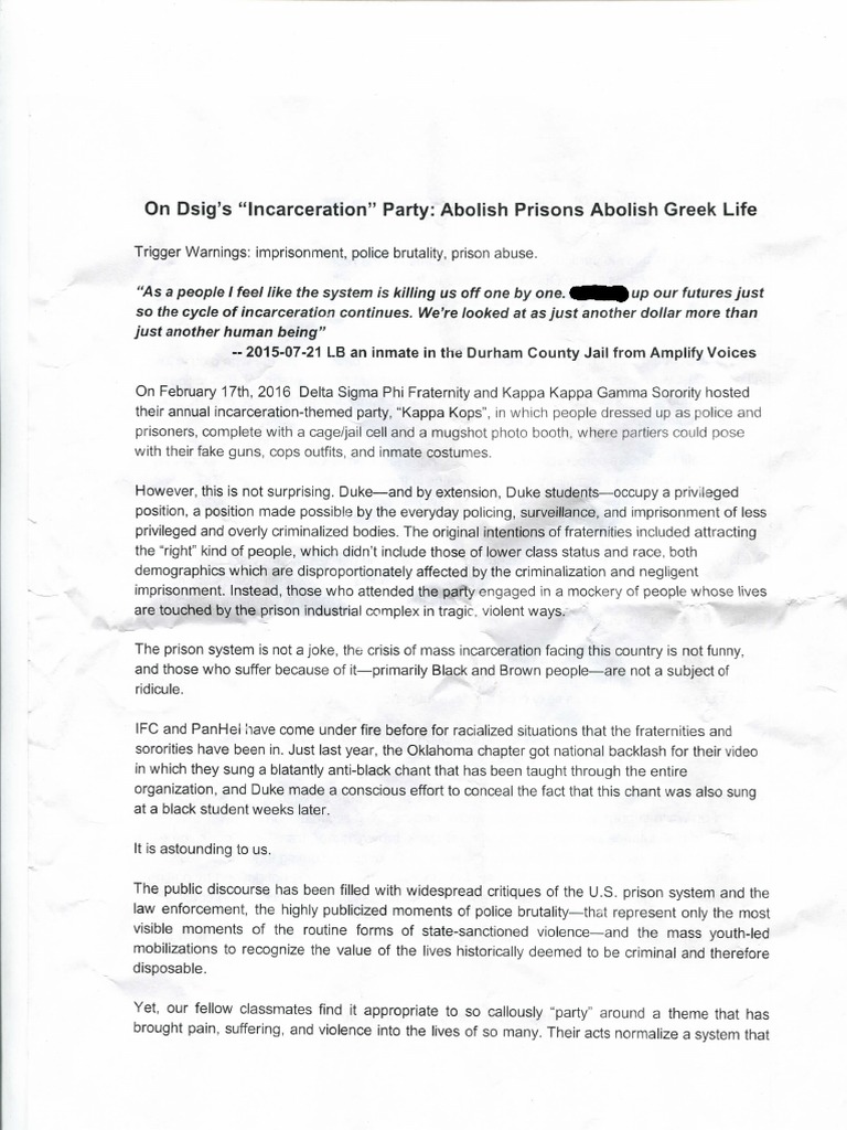 Statement from protestors of incarceration-themed Greek life party