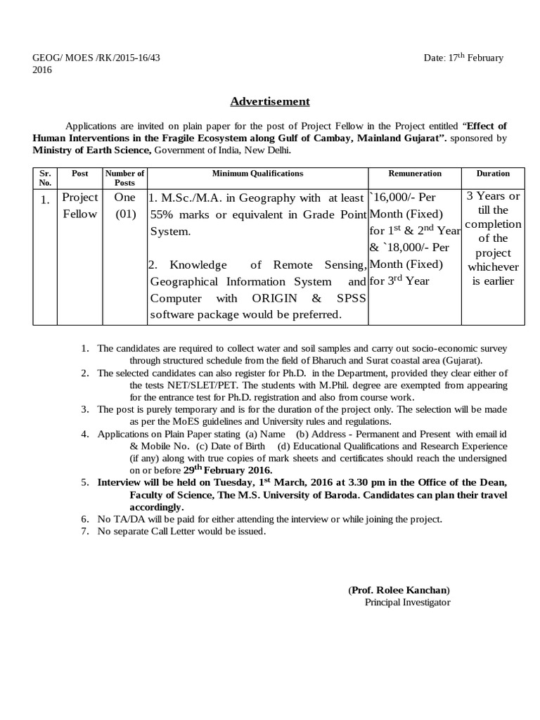 Applications are invited on plain paper for the post of Project Fellow in the Project entitled Effect of